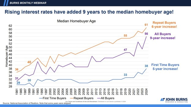 The median homebuyer age has risen to 56(!!), the highest level since at least 1981 and almost certainly since, well, forever. Put another way, it’s a good time to be buying a home in cash and a very bad time to be financing one.